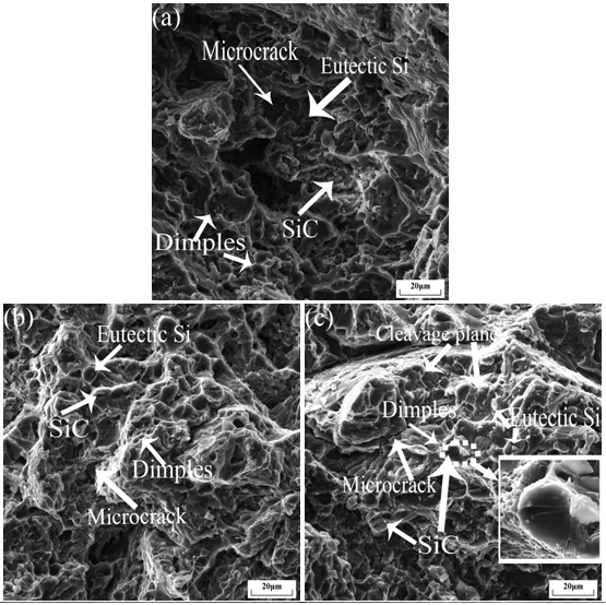 圖4:擠壓鑄造及不同熱處理后SiCp/ZL101鋁復合材料力學性能 圖5是不同熱處理條件下的SiCp/ZL101鋁復合材料拉伸斷口形貌。從圖5a可以看出,經過擠壓鑄造后的復合材料斷口特征是典型的塑性斷裂,界面上分布著大量的大小不等的韌窩,韌窩尺寸較大,而且比較深,撕裂棱很明顯,韌窩內部有平整的共晶Si相界面,這是因為在拉伸試驗過程中,因為晶界處缺陷較多,且條共晶Si相力學性能較基體更差,微裂紋產生于條狀共晶Si相內部,并在擴展的過程中穿過第二相形成韌窩,因此復合材料強度較低。固溶處理后(見圖5b)斷口形貌仍以韌窩為主,韌窩變得均勻,而且尺寸明顯變小,撕裂棱數量減少,因此復合材料強度有明顯的提升而塑性變化不大。