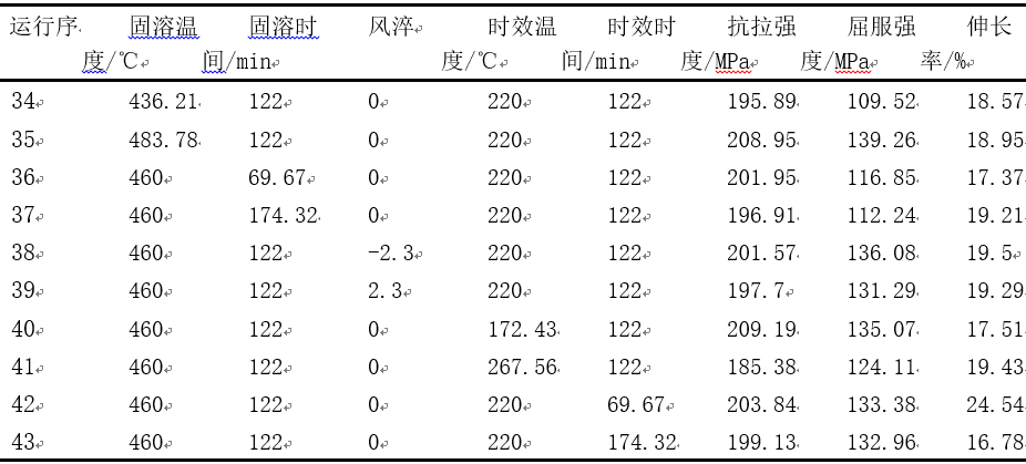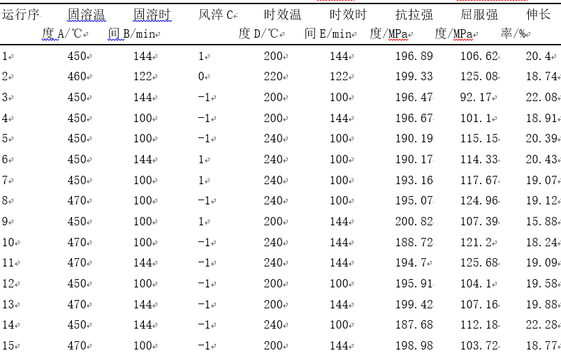 表2:T7熱處理試驗設計變量兩水平值設置 為了充分研究各個熱處理參數的交互作用對力學性能的影響,采取了五因子兩水平的全因子設計,且為了了解相互的彎曲位置,還進一步選用CCD中心復合試驗設計,所有的因子項均不混淆,見表3。