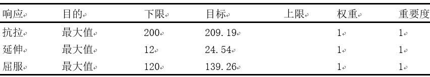 表5:增加軸點的實驗設計方案和力學性能結果 加了軸點數據后,繼續用minitab對數據進行響應曲面分析,把P大于0.05的進行刪減精簡得出各項力學性能的回歸模型如下: 抗拉強度=-197+0.801*固溶溫度-0.0367*固溶時間+5.29*風淬+0.527*時效溫度+2.021*時效時間- 0.001645*時效溫度*時效溫度-0.00448*固溶溫度*時效時間-0.0375 固溶時間*風淬 屈服強度=-236.8+0.453*固溶溫度+1.459*固溶時間+0.2926*時效溫度-0.00610*固熔時間*固溶時間 伸長率=21.62+0.02780*固溶時間-0.04616*時效時間 響應優化參數見表6,可以看出對抗拉強度、屈服強度、伸長率進行望大處理,下限設為試棒力學性能要求的最小值,目標為各自的上限,最后得出最終精化模型的多響應優化見圖6。