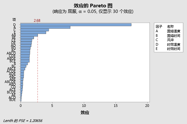 表4:全因子試驗設計方案和力學性能 2.2 試驗分析 使用Minitab分別對抗拉強度、屈服強度和伸長率進行所有項的因子分析,得出對各力學性能的Pareto圖見圖3~圖5,但因子分析結果均沒有出現P值,需要按Pareto圖進行模型精簡,騰出自由度并計算出殘差誤差,從而計算出P值。對抗拉強度只保留了D、A、C、E以及AE交互;對屈服強度只保留了D、A、C、E、AB、B;對伸長率只保留了E、B;另外從圖3和圖4可知時效溫度D對抗拉強度和屈服強度影響最大,其次是固溶溫度A,從圖5可知時效時間E和固熔時間B對伸長率影響最大。
