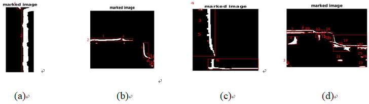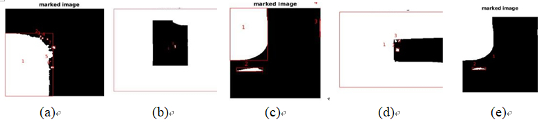 表1:缺陷面積以及周長 圖8a中有一連串的氣孔,普遍面積較小,并且有一部分氣孔被白色光源污染導(dǎo)致無法被提取。其他氣孔的面積和周長都被很好的提取出來了,如果在拍攝圖像的時(shí)候?qū)ο袼攸c(diǎn)的長度進(jìn)行標(biāo)度,也就能直接得到氣孔缺陷的面積和周長了,對(duì)后續(xù)的工藝分析能夠提供幫助。 然后展示對(duì)夾渣缺陷面積和周長的特征提取,同樣首先先對(duì)圖像中的缺陷部位進(jìn)行捕獲,見圖9。