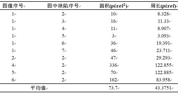 圖9:夾渣缺陷的特征提取效果 從圖9可以看出,提取效果整體較好,但會(huì)出現(xiàn)一些過度提取的情況,這個(gè)時(shí)候需要人工來幫助判斷具體哪一個(gè)部分才是真正的夾渣缺陷。表2為提取到的缺陷的周長和面積。