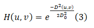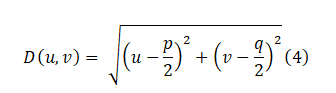 式中,Do為截止頻率;D(u,v)為各點(diǎn)與頻率矩形中心的距離。其中D(u,v)的計(jì)算公式如下: