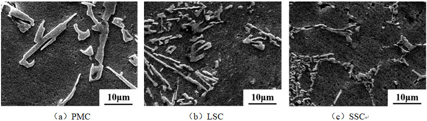 圖3:不同鑄造方式制備A356鋁合金α-Al晶粒尺寸 Al-Si共晶通常被認為是不規則共晶,其生長方式為小平面生長,用掃描電鏡對共晶Si相進行進一步觀察,見圖4。圖4a是PMC試樣的共晶Si相電鏡照片,由于α-Al基體不規律、不均勻的排布使得析出在其晶界上的共晶Si也明顯的偏析和集聚的問題。共晶Si相呈現出的是尺寸較大的針狀或板片狀,分布在基體晶界處,嚴重地割裂基體。LSC試樣的共晶Si晶粒得到了較大程度的細化轉變為小片狀和長桿狀(圖4b),但偏析現象依然存在。轉變漿料狀態為半固態后,見圖4c,SSC試樣的共晶Si相的尺寸明顯減小,邊緣明顯圓鈍,整體形狀彎曲,呈現出蠕蟲狀的形貌,說明SSC過程中對共晶Si相產生了一定程度的球化。