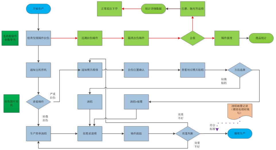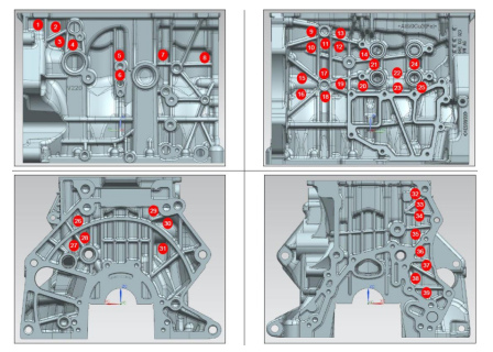 圖7:熱成像儀對模具溫度進行分析控制 影響模具溫度的參數很多,除了直接監控模具溫度外,定期監控冷卻水流量,脫模劑噴嘴是否堵塞,以及鑲塊是否按要求定期清理和更換等均非常重要。 2.5 產品檢驗 在實際生產過程中由于各種各樣的原因也可能導致零件泄漏,因此對零件進行定期檢測十分必要。針對壓鑄內部縮孔可進行定期的X光和CT進行掃描;針對零件表面拉傷,鑄造工人可通過目視進行檢測,一旦發現表面拉傷、粘模,需要停機確認產生原因,避免批量質量問題產生,同時有必要對零件進行追溯,圖8是針對發現零件表面拉傷后的控制方案;另外針對有局部擠壓工藝的,需要定期測量零件的擠壓深度,以監控局部擠壓的有效性。常見的缺陷是局部擠壓深度不足,這種情況下很多時候是由于擠壓銷卡滯導致。當出現產品泄漏后,以及試漏不良率較高時可對產品進行浸滲,試漏不合格且泄漏值在一定范圍內的零件進行100%浸滲,二次試漏合格率在95%以上。但浸滲成本相對較高。圖9是總結的關鍵控制點。運用該方案我們連同壓鑄件生產廠家對發動機涉及機油通道和冷卻液通道(見圖10)的所有壓鑄鋁件進行了梳理,取得了非常好的成果。
