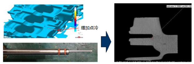 圖2:缸蓋罩蓋模具優化(從單側澆道更改為雙側澆道) 模具設計時通常需要運用專業軟件對模具進行模流和模溫分析,以識別出鋁液在填充過程中是否存在卷氣,澆口截面積是否合理,以及零件成形過程最后的冷卻位置,以便合理設計工藝過程和適當優化模具結構。因此在進行模擬分析時要注意:第一,模具和實體的一致性,同時需要充分考慮模具內部的冷卻通道、澆冒口等。第二,網格的劃分影響著模擬分析的準確性,在網格劃分時需要考慮網格的類型和數量,以及網格隨著零件壁厚的分布而變化。第三,鋁液材料數據的準確性,在設置材料屬性時需要考慮材料的熱膨脹系數、收縮率、粘度等。第四,過程參數設置也需要和實際情況保持一致,如模具溫度、鋁液填充溫度、保壓曲線、填充控制方式、壓鑄參數等。 2.2 模具/產品結構優化 某缸體在加工之后發現靠近水道的螺栓孔內存在較大縮孔(見圖3),同時在產品100%的泄漏測試時,水道泄漏不良率較高。對缺陷產品進行外觀檢測和CT掃描發現,水道內壁存在輕微拉傷和內部縮孔貫穿導致泄漏。對產品進行分析發現該位置壁厚較大,內部易形成縮孔。由于該位置需要進行機加工,因此可在模具上增加型芯形成預鑄孔,從而減小壁厚,利于鑄件冷卻同時對型芯表面進行了被覆處理,便于脫模劑附著,從根本上避免了縮孔產生和預鑄孔表面拉傷。