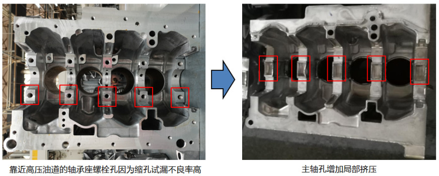 圖5:增加高壓點冷,縮孔得到明顯改善 某缸體加工后進行100%的產品泄漏測試,發現產品試漏不良率較高,經過對不良品統計分析,發現95%為高壓油道測試不合格。CT掃描發現,靠近高壓油道的主軸承座螺紋孔底部存在較多縮松,增加預鑄孔后試漏不良率并未得到明顯改善。隨后在主軸孔增加局部擠壓工藝(見圖6),使該位置更加致密,從而減少縮孔、縮松,經過驗證,試漏不良率從4%下降至0.2%,效果明顯。