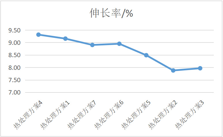 圖8:不同熱處理條件下的伸長率變化 通過圖7和圖8可以在幾組試驗中的材料抗拉強度和屈服強度變化不大,伸長率隨固溶處理溫度的升高和人工時效溫度的升高呈下降趨勢,另外可以看出,延長人工時效的時間可以提高材料伸長率,降低固溶熱處理溫度可以提高材料伸長率。 4.結論 (1)由于壓鑄件內澆口附近的壓力較高,并向填充末端鑄件遞減,高真空壓結構鑄件在熱處理后內澆口附近的力學性能好于填充末端的。 (2)較低的固溶溫度和較長的人工時效時間以及較低的人工時效溫度可以取得較好的力學性能。
