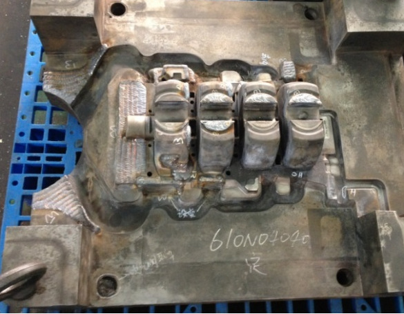 ![]() 摘要:敘述了某壓鑄模具定模芯的燒蝕、裂紋、粘鋁等失效情況,并分析了形成原因。修模處理分為標(biāo)記、焊接、數(shù)控銑和電火花加工等工藝過程,所修復(fù)模具的質(zhì)量滿足技術(shù)要求。同時(shí),探討了提高壓鑄模具使用壽命的措施,包括模具結(jié)構(gòu)設(shè)計(jì)合理、模具材料選擇正確、熱處理工藝優(yōu)化、使用環(huán)境恰當(dāng)以及維修保養(yǎng)規(guī)范。 壓鑄模具由于長(zhǎng)時(shí)間處于高溫、高壓、高速的工作環(huán)境下,模具表面產(chǎn)生周期性的應(yīng)力和應(yīng)變,使用一定時(shí)期以后就會(huì)出現(xiàn)龜裂、燒蝕、裂紋等損壞情況,導(dǎo)致模具不能繼續(xù)使用,只有經(jīng)過修理之后,才能繼續(xù)投入生產(chǎn)。因此,在壓鑄模具使用過程中,修模非常重要,既能保證生產(chǎn)出合格的產(chǎn)品,又能延長(zhǎng)模具的使用壽命。 1、失效形式及原因 圖1為某鋁合金缸體的壓鑄模具定模芯,其材質(zhì)是H13鋼,在生產(chǎn)中出現(xiàn)失效情況,其失效形式及原因分析如下。
