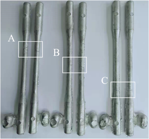 ![]() 原標題:增壓比壓對Al-Zn-Mg-Cu合金流變壓鑄件熱裂傾向的影響 摘要:采用半定量熱裂傾向評定方法對Al-Zn-Mg-Cu合金半固態流變壓鑄件的熱裂傾向性(HTS)進行評估,分析了不同增壓比壓下鑄件的熱裂斷口形貌及截面孔洞分布。結果表明,增壓比壓為67~94 MPa時,合金熱裂傾向隨增壓比壓的提高呈先減小后增大的趨勢,在增壓比壓為87 MPa時熱裂傾向系數最小為15,繼續提高至94 MPa時,熱裂傾向最高,HTS值為27。試樣內部孔洞對熱裂影響程度最為劇烈,是熱裂紋萌生的起源。合金凝固補縮不足時導致的晶間分離是孔洞產生的主要原因,提高增壓比壓可以有效降低鑄件孔隙率,但太高的增壓比壓會給正在凝固的鑄件形成沖擊力作用,使鑄件開裂并加劇熱裂傾向。 Al-Zn-Mg-Cu高強度鋁合金因優異的性能被廣泛應用于航空航天、交通運輸等領域,但因該系合金固液溫度區間寬,漿料流動性差,在鑄造過程中易產生熱裂,往往會造成成品率低,限制了其應用范圍。流變壓鑄技術具有組織均勻細小、近球形,充型時不易卷氣,凝固收縮小且高壓補縮等特點,產生熱裂和孔洞的傾向低,十分有益于變形鋁合金鑄造過程中熱裂缺陷的控制。因此,了解Al-Zn-Mg-Cu合金流變壓鑄過程中的熱裂機理,并通過調整工藝參數達到有效控制熱裂、孔洞等缺陷產生,是實現鑄造高強度鋁合金件以及大規模應用的關鍵。熱裂缺陷的產生和孔洞密切相關,在流變壓鑄中,孔洞往往主要是由縮孔所引起的。盡管大量研究者在熱裂這一機理和影響因素上進行了一系列研究,但關于Al-Zn-Mg-Cu合金流變壓鑄過程中熱裂傾向的研究卻鮮有報道。本課題以探究流變壓鑄Al-Zn-Mg-Cu高強鋁合金的熱裂傾向為導向,采用了半定量熱裂評定方法,分析了熱裂試樣的斷口組織和孔洞微觀形貌,系統的研究了增壓比壓對熱裂傾向的影響。 1、試驗材料與方法 本試驗所用材料為Al-Zn-Mg-Cu合金,其化學成分見表1。