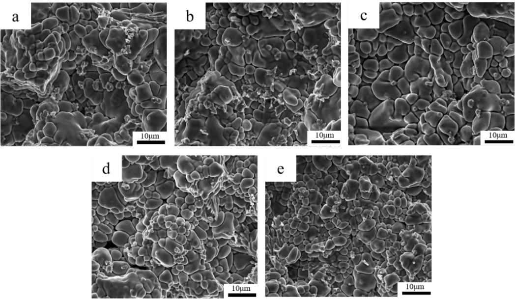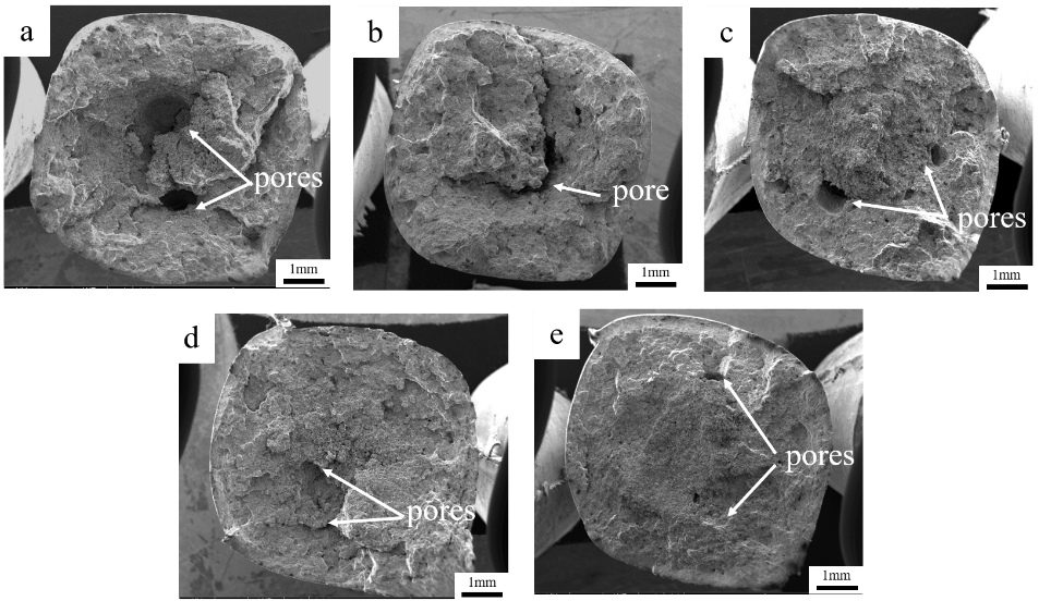 圖4 不同增壓比壓下試樣斷口典型形貌: 圖 4為不同增壓比壓流變壓鑄制備出的Al-Zn-Mg-Cu合金試樣熱裂斷口形貌。可知試樣的斷口表面均有著縮孔缺陷分布,斷面平整度不高。隨著增壓比壓增加,縮孔由試樣中心逐漸向外擴展,且縮孔大小有顯著的變化。當比壓小于81 MPa時,斷口中心區域分布著較大的縮孔,在81 MPa時,斷口中心區域表現為疏松,縮孔主要分布在斷口截面徑向0.5R區域范圍;大于81 MPa時,斷口中心區域已經不能明顯看到組織疏松的存在,且縮孔大小進一步降低。此外,在所有的斷口邊緣區域,可見有較為平整的斷面區域,組織也較為均勻致密。
