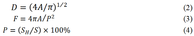 圖12 不同增壓比壓下Al-Zn-Mg-Cu合金流變壓鑄件孔隙率統計 圖 13為不同增壓比壓下Al-Zn-Mg-Cu合金流變壓鑄件斷裂試樣平行段及過渡段孔洞的數量及形狀因子與等效直徑變化的關系曲線。從圖 13a可知,在不同的增壓比壓下,孔洞的數量在整體上隨著等效直徑的增大而減小,孔洞的數量在等效直徑低于0.4 mm時較多,數量達數百個。當等效直徑超過0.4 mm時,孔洞的數量急劇減少,均低于50,且隨著等效直徑的增大孔洞數量呈整體下降的趨勢。在相同的孔洞等效直徑下,隨著增壓比壓增加,孔洞的數量逐漸減少。在孔洞的等效直徑低于0.4 mm時,提高增壓比壓對減少孔洞數量效果十分顯著,高于0.4 mm時孔洞的數量減少有所放緩。圖 13b可以看出,不同增壓比壓下孔洞的形狀因子隨等效直徑的增加而降低,且整體上形狀因子的變化十分劇烈。在等效直徑高于0.6 mm時,不同增壓比壓的鑄件試樣孔洞的形狀因子都低于0.5。