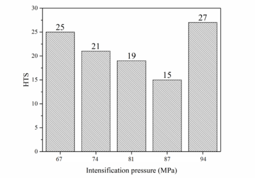 表2 試樣熱裂數量及概率 表 2為不同增壓比壓下Al-Zn-Mg-Cu合金流變壓鑄試樣的熱裂紋分布及統計結果。可以看出,在不同的增壓比壓下,試樣的熱裂以斷裂形式為主。斷裂主要產生在試樣的過渡段和平行段,夾持段未發生斷裂行為。在不同增壓比壓下兩個區域斷裂產生的數量相差很小,平行段斷裂數量要略高于過渡段。將熱裂評定試樣結果統計轉換為熱裂傾向值HTS,結果見圖 2。可知隨著增壓比壓增加,Al-Zn-Mg-Cu合金流變壓鑄試樣的熱裂傾向值HTS呈先減小后增大的趨勢。在增壓比壓為87 MPa時,HTS最小為15,當增壓比壓提升至94 MPa時,HTS最大為27,有著最為嚴重的熱裂傾向。