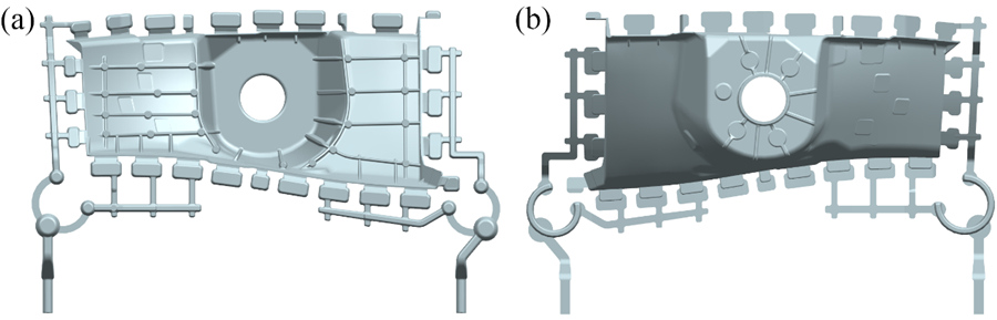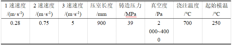 (a)減震塔正面 (b)減震塔反面 采用力勁DCC2500壓鑄機(jī),工藝參數(shù)見(jiàn)表 2。其中1速和2速屬于低速階段,3速屬于高速階段,3速起點(diǎn)即是沖頭高低速切換的位置。本試驗(yàn)設(shè)定了3個(gè)高低速切換位置,分別為560 mm、580 mm和600 mm,制備了相應(yīng)的鑄件并對(duì)壓鑄過(guò)程進(jìn)行模擬。模擬使用EKKCapcast軟件,考慮計(jì)算的精度和求解效率,采用密網(wǎng)格進(jìn)行劃分,減震塔和壓室的網(wǎng)格總數(shù)為2 310 053。