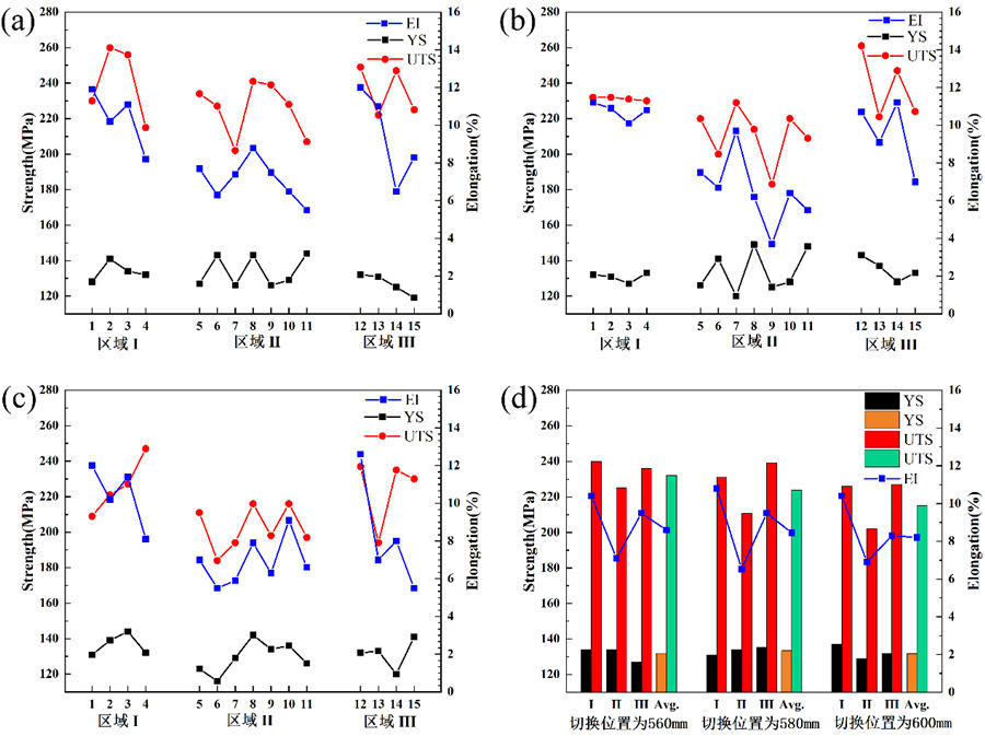 (a)橫截面全貌,(b)細(xì)晶層,(c)中心區(qū)域,(d)中心區(qū)域SEM形貌 2.2 力學(xué)性能 為研究高低速切換位置對(duì)減震塔的力學(xué)性能的影響,對(duì)不同鑄件進(jìn)行本體取樣,取樣位置包含遠(yuǎn)、近澆口區(qū)域,這些試樣可以反應(yīng)鑄件的整體力學(xué)性能。切割得到的拉伸片尺寸為54.5 mm × 15 mm,厚度與取樣位置有關(guān)。其中,1~4號(hào)試樣厚度為3 mm,其余試樣厚度為2.5 mm。