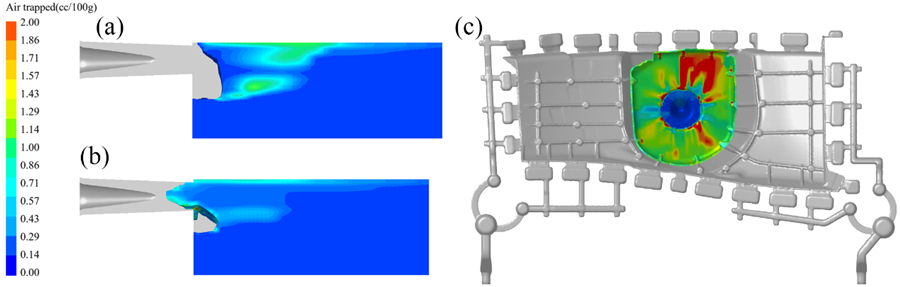 圖5 高低速切換位置為580 mm的減震塔不同視角下的卷氣分布 6是充填時(shí)間為0.9486 s和0.9511 s時(shí)壓室內(nèi)金屬液的流動(dòng)形態(tài)。低速切換到高速后使得壓室上方的金屬液流速加快,率先充入型腔并封住澆口。而下方的金屬液相對(duì)滯后,與壓室壁形成較大的包卷,導(dǎo)致壓室內(nèi)部分氣體無(wú)法順利排出,使得金屬液卷氣量大大增加。圖 6c是金屬液剛進(jìn)入型腔時(shí)的卷氣分布,可見(jiàn)澆口右上角卷氣嚴(yán)重的金屬液將要向10號(hào)和11號(hào)試樣的方向充填。即使溢流槽已經(jīng)容納了大部分卷氣金屬液,但仍有部分卷氣金屬液停留在溢流槽周?chē)沟?0號(hào)和11號(hào)試樣位置卷氣較為嚴(yán)重。