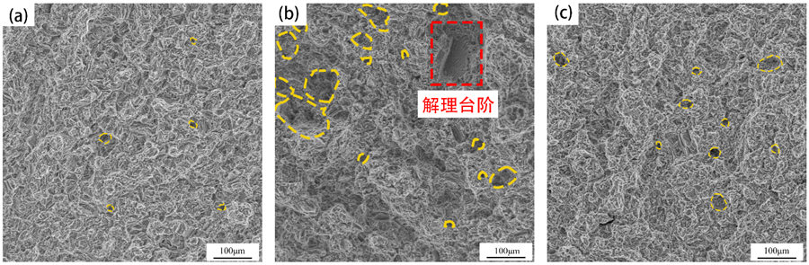 圖6 (a)、(b)壓室內(nèi)金屬液的流動(dòng)形態(tài),(c)金屬液剛充填型腔時(shí)卷氣的分布 區(qū)域Ⅲ的13號(hào)試樣和14號(hào)試樣位置處有輕微卷氣。結(jié)合金屬液的充型模擬結(jié)果可知,13號(hào)試樣位置的卷氣在金屬液充型過(guò)程中變化很小。壓室內(nèi)包卷產(chǎn)生的卷氣金屬液向13號(hào)試樣方向流動(dòng)時(shí),大部分卷氣金屬液流進(jìn)了溢流槽內(nèi),這說(shuō)明溢流槽起到了較好的排溢作用。14號(hào)試樣有輕微卷氣的原因與區(qū)域Ⅱ的10號(hào)和11號(hào)試樣一致。 2.4 斷口形貌 在3個(gè)區(qū)域內(nèi)各選擇一個(gè)有代表性的試樣,觀(guān)察該試樣的斷口形貌。圖 7是區(qū)域Ⅰ的1號(hào)試樣、區(qū)域Ⅱ的9號(hào)試樣和區(qū)域Ⅲ的13號(hào)試樣的斷口形貌。在3個(gè)斷口形貌中均可以觀(guān)察到小而淺的韌窩,并伴有大量微觀(guān)撕裂棱,是典型的韌脆性混合斷裂。從圖 7a可以看出,1號(hào)試樣斷口最為平坦,有少量的氣孔(黃色虛線(xiàn)標(biāo)出),未觀(guān)察到明顯的其他鑄造缺陷。氣孔尺寸較小,直徑最大不超過(guò)30 μm。可能是金屬液沖擊加強(qiáng)筋型壁之后,其反向回卷的壓力將某些宏觀(guān)氣團(tuán)擠壓破碎,形成較為分散的微觀(guān)氣團(tuán)。圖 7b為9號(hào)試樣的斷口形貌,可以看出其斷口高低落差較大,存在直徑約為200 μm的大尺寸氣孔,同時(shí)伴隨有較多的小尺寸氣孔。此外,其斷口上幾乎不存在韌窩,并發(fā)現(xiàn)有脆性斷裂特有的解理臺(tái)階(方框標(biāo)出),這導(dǎo)致9號(hào)試樣的伸長(zhǎng)率僅為3.7%。圖 7c為13號(hào)試樣的斷口形貌,與圖 7a所示1號(hào)試樣斷口形貌基本一致,僅增加了少量的小尺寸氣孔。