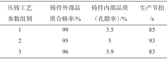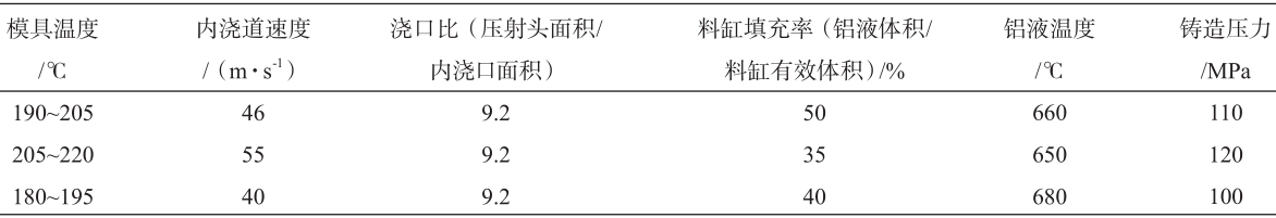 表2 壓鑄工藝參數 采用3組壓鑄工藝參數各試產1 000件,分別對電機殼體鑄件外部質量、CT掃描進行檢查和生產節拍平均值統計,結論見表3。殼體鑄件的壁厚差異較大,模具不同部位的蓄熱量不同,壁厚越厚蓄熱量就越大,試驗結果顯示鑄件壁厚大于10 mm的部位模具溫度控制在180~195 ℃最為合理,壁厚在4~6 mm之間的部位模具溫度控制在195~205 ℃最為合理;內澆道速度直接影響填充時間、模具壽命、鑄件表面質量,速度過快會過早沖蝕模具表面,鋁液在噴射過程卷氣量較大,同時會造成排氣不暢通,導致鑄件產生氣孔等缺陷;內澆道速度為46 m/s時,外觀質量和內部質量最佳,見圖10。澆口比是控制充填速度和壓力傳遞的關鍵參數,是CAE仿真分析后設計出來的;生產效率第三組工藝參數最佳,但是合格率偏低。綜合生產效率和品質考慮得出,第一組為最佳工藝參數。鑄件內部前十大內部缺陷中最大直徑為1.539 mm,孔隙率為3.5%,遠遠低于VW 50093:2012-075壓鑄件孔隙率5%的標準。