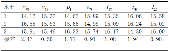 根據圖4,通過正交計算,可以得出試驗均值響應表,詳見表6;根據圖5,通過正交計算,可以得出試驗信噪比響應表,見表7。