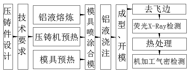 圖2 殼體設計流程 為了得到合格的薄壁殼體零件,要對殼體毛坯進行去飛邊、X射線檢測、紫外線熒光檢測。其中, X射線檢測是為了檢查零部件內部縮松、縮孔等缺陷;紫外線熒光檢測,是檢查殼體表面的微小鑄造裂紋;由于殼體屬于功能性裝配件,還有氣密性檢測要求,所以需要對殼體進行泄漏檢測,保證殼體工作時,流通的高溫氣體不泄露,可以快速建立起壓力。根據薄壁殼體的投影面積,選擇合模力為3 500 kN的力勁冷壓室壓鑄機。 1.1.1 殼體鑄造過程關鍵工藝