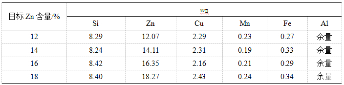 圖1 拉伸試樣尺寸圖 2、試驗結果與分析 2.1 Zn含量對合金的力學性能的影響 圖2和圖3分別為合金力學性能隨Zn含量的變化規律。可以看出,隨著Zn含量從12%提高到18%,合金的抗拉強度和屈服強度逐漸提高,抗拉強度從345.5 MPa提高到395.4 MPa,屈服強度從263.5 MPa提高到343.9 MPa,分別提高了14.4%、30.5%;伸長率隨著Zn含量的提高逐漸降低,由1.72%降低到1.15%。由此可見,合金中Zn含量的提高可以極大的提高合金的強度,但會使合金的塑性降低。