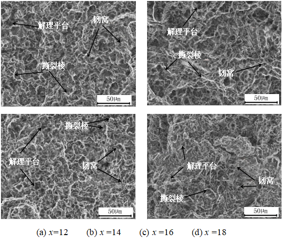 圖3 不同Zn含量下Al-Zn合金的伸長率 2.2 斷口形貌分析 圖4為不同Zn含量下Al-Zn合金的拉伸斷口形貌。可以看出,合金的斷口組織主要由少量解理平臺、大量韌窩和撕裂棱組成。隨著合金中Zn含量增加,合金斷口組織中存在的韌窩數量和撕裂棱逐漸減少,解理平臺面積相對增多。Zn含量增加到18%后,斷口組織中的韌窩和撕裂棱數量達到最少,總體呈現脆性斷裂特征。