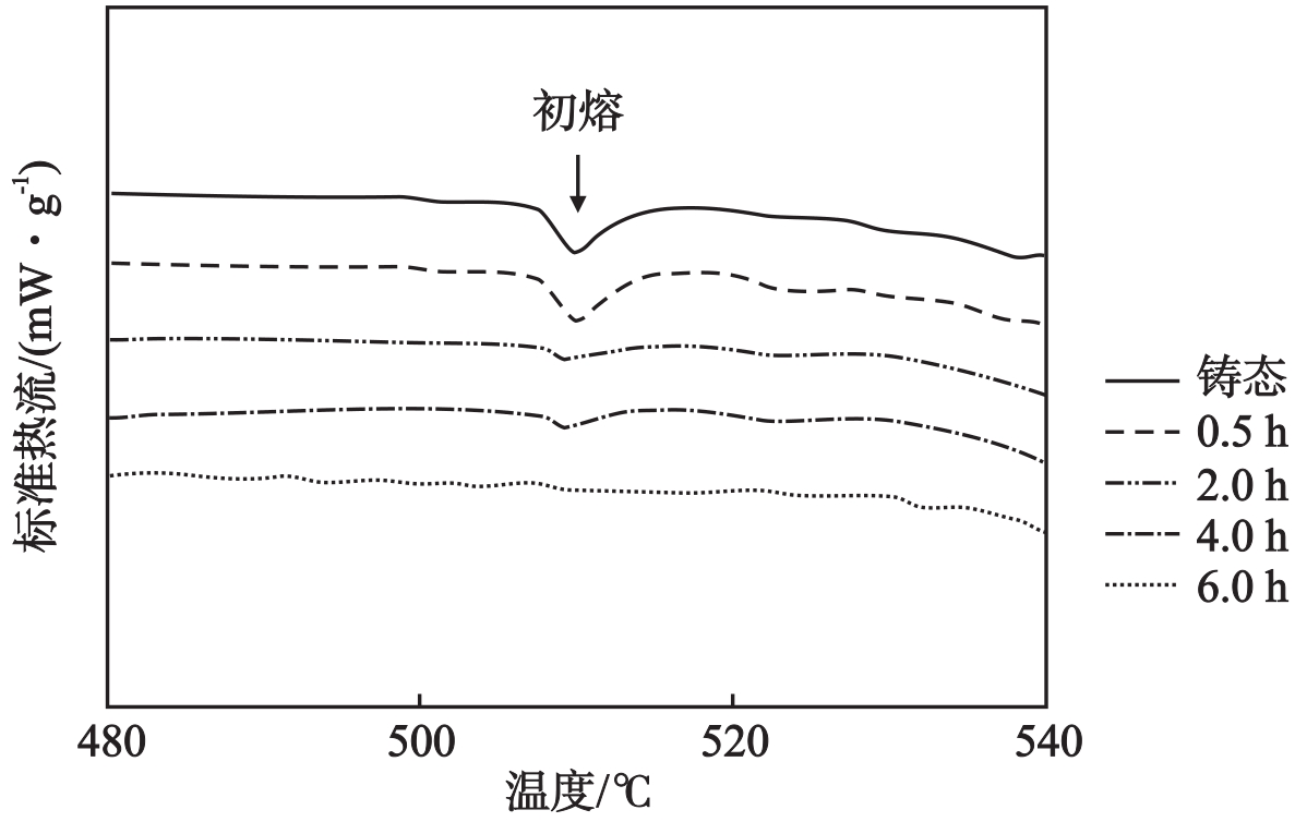 圖3 鑄造鋁硅合金升溫過程的示差掃描熱量分析曲線 為了獲得該低熔點化合物相溶解所需時間,對495℃固溶處理0.5~6h的試樣進行差熱分析,結果如圖4所示。從圖4可以看出,合金在509℃出現吸熱峰,并且隨著固溶處理時間的增加,吸熱峰對應的溫度均為509℃,但是吸熱峰的峰值幅度逐漸減小,直至495℃固溶處理6h后,峰值消失。因此第一階段的固溶處理方案為:固溶溫度495℃,固溶時間6h。