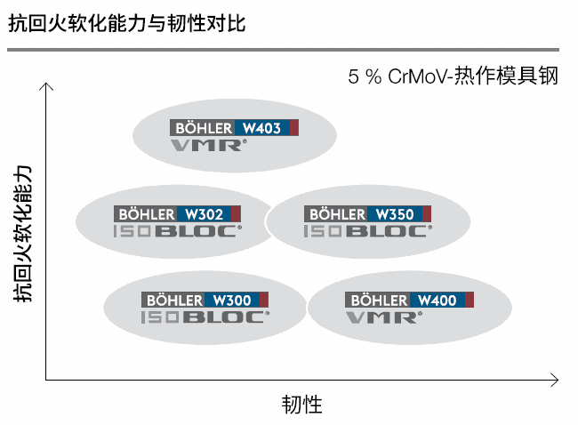 對(duì)于無法做成鑲塊的情況,模具鋼材選擇需要考慮高溫強(qiáng)度,例如Bohler W403VMR,W403VMR采用真空電弧重熔,保證高合金當(dāng)量材料的韌性,緩解沖蝕問題同時(shí)規(guī)避次生風(fēng)險(xiǎn)的發(fā)生。