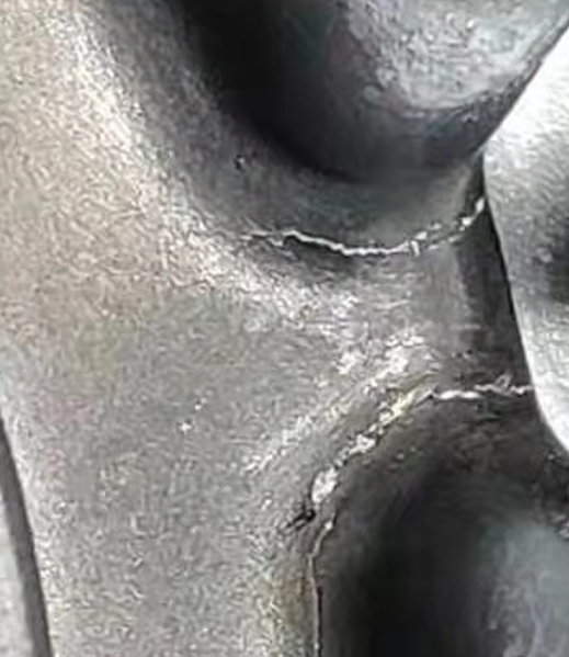 輔助氮化或者涂層,可以進(jìn)一步改善沖蝕現(xiàn)象。 二、龜裂:由熱交變應(yīng)力,拉應(yīng)力,塑性應(yīng)變綜合作用引起的失效形式。如圖4所示,產(chǎn)品表面呈現(xiàn)缺料,裂紋缺陷。