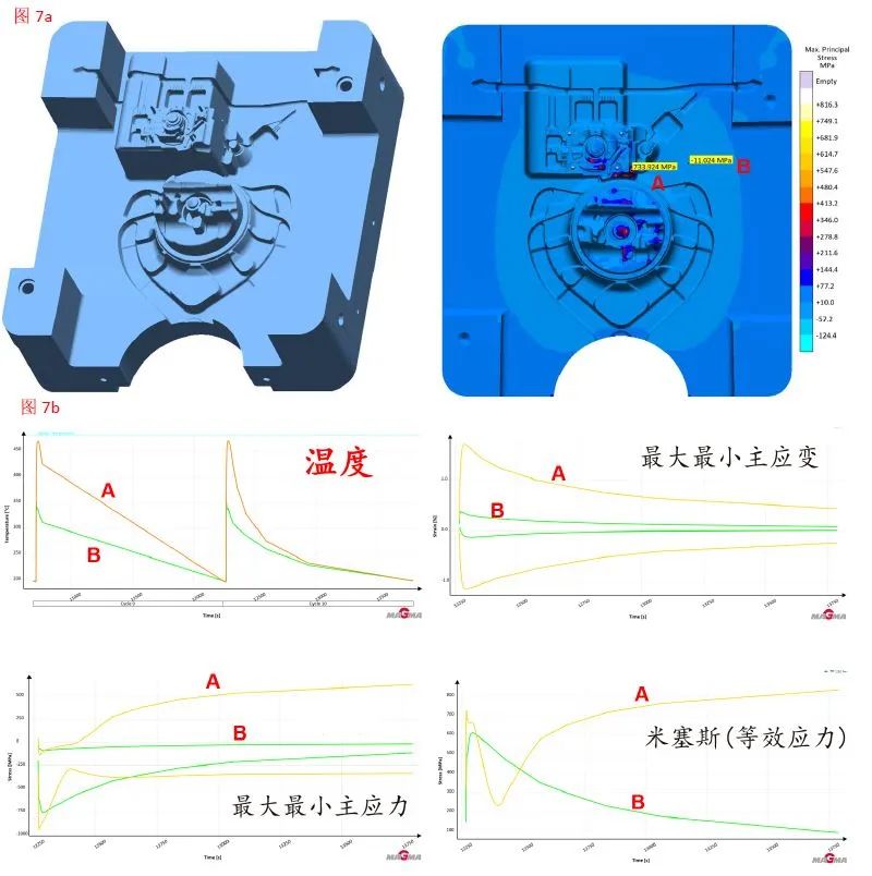 圖7 最大主應(yīng)力結(jié)果與應(yīng)力曲線結(jié)果 如圖7a右圖所示,在模具表面取A,B兩點(diǎn)。其中A點(diǎn)為缺陷位置,B點(diǎn)為無缺陷位置,結(jié)果顯示A點(diǎn)的最大主應(yīng)力大于B點(diǎn)。結(jié)合應(yīng)力曲線結(jié)果可以觀察到,A點(diǎn)的溫度高于B點(diǎn),A點(diǎn)的最大最小主應(yīng)力差值大于B點(diǎn),最大最小主應(yīng)變和米塞斯應(yīng)力曲線結(jié)果也呈現(xiàn)相同情況。 缺陷判斷結(jié)果小結(jié):應(yīng)力結(jié)果,應(yīng)力曲線結(jié)果等。