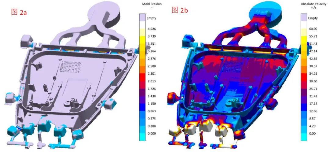 如圖1所示,金屬液充型過程中內(nèi)澆口速度相對(duì)過高,且長(zhǎng)時(shí)間對(duì)模具進(jìn)行沖擊,造成模具表面出現(xiàn)凹凸不平的坑洼狀,映射到產(chǎn)品對(duì)應(yīng)位置呈現(xiàn)出聚集顆粒狀不平表面。 圖2 沖蝕結(jié)果與成型速度結(jié)果 針對(duì)于此種類型的失效形式,在MAGMASOFT®中首先可以通過沖蝕結(jié)果進(jìn)行快速甄別。如圖2a所示,圖片中高亮位置為軟件預(yù)判的缺陷位置,模擬結(jié)果與實(shí)際缺陷位置相對(duì)應(yīng)。然后通過成型速度結(jié)果進(jìn)行輔助驗(yàn)證,如圖2b所示,沖蝕位置速度結(jié)果呈高亮顯示,表示其充型速度相對(duì)較高。(針對(duì)于不同材料性能上的差異,可以在軟件中設(shè)定不同的臨界速度值)