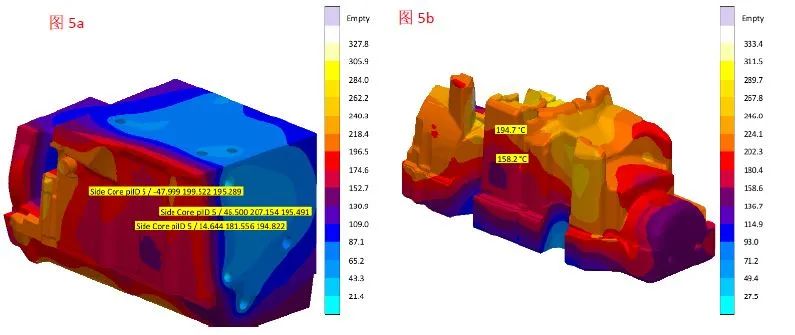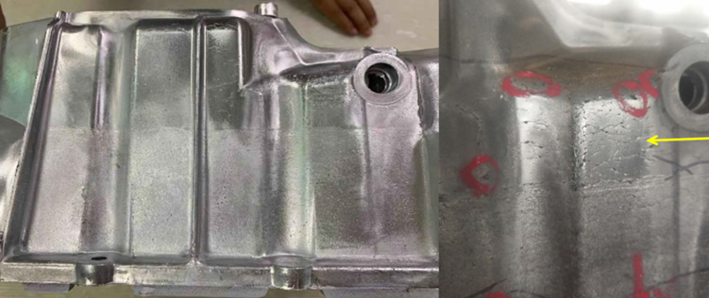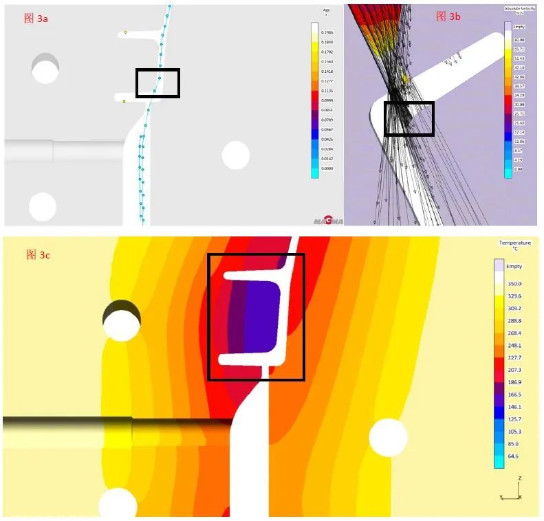 圖4 缺陷圖片 通過觀察模具溫度模擬結(jié)果(圖5a)缺陷位置對(duì)應(yīng)的模具呈現(xiàn)表面溫度高,背溫低的狀態(tài),出現(xiàn)了巨大溫度差。