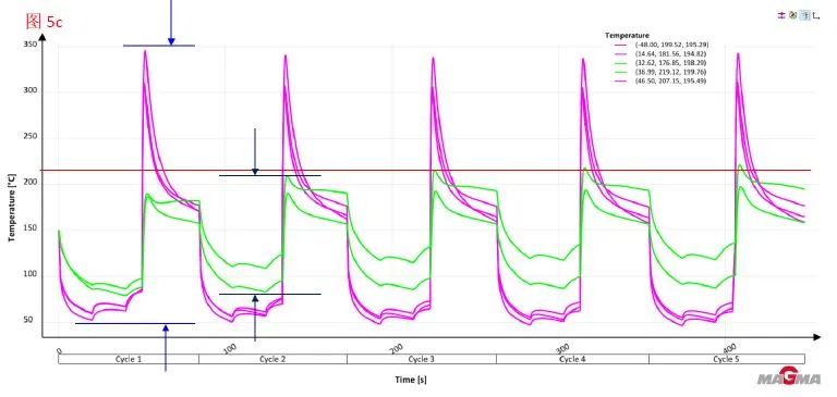 圖5 模具溫度結(jié)果與溫度曲線結(jié)果 同時(shí),如圖5c所示,一共5條曲線,三條紫色曲線為缺陷模具表面取點(diǎn)生成,兩條綠色曲線為無缺陷模具表面取點(diǎn)生成,圖片顯示了5個(gè)生產(chǎn)循環(huán)。通過觀察曲線的變化規(guī)律可以發(fā)現(xiàn),在每個(gè)生產(chǎn)循環(huán)中,缺陷模具表面的溫度曲線變化劇烈。 缺陷判斷結(jié)果小結(jié):模具溫度結(jié)果,溫度曲線結(jié)果等。 對(duì)策:提高模具材料的硬度,強(qiáng)度,韌性,延展性,導(dǎo)熱性均可改善龜裂現(xiàn)象。