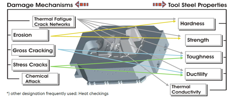 在模具溫度場(chǎng)無法達(dá)到較理想狀態(tài)的生產(chǎn)條件下,Bohler W400VMR +氮化/涂層,高韌性、高延展性材料輔以表面處理可以提高抵抗疲勞裂紋出現(xiàn)的能力。
