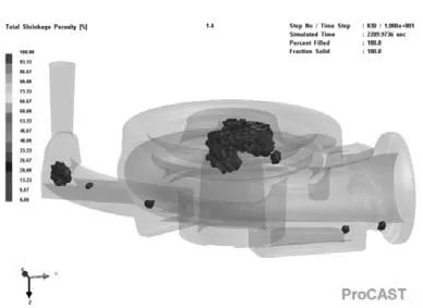 圖7 3 s時刻鑄件的充型凝固溫度場 從圖中可以看出,金屬液沿著內澆道貼型腔壁注入然后逐漸充滿型腔,在整個充型過程中,金屬液流動相對較平穩(wěn),沒有出現明顯的卷氣現象。該壓殼鑄件的縮松、縮孔模擬結果如圖8所示。