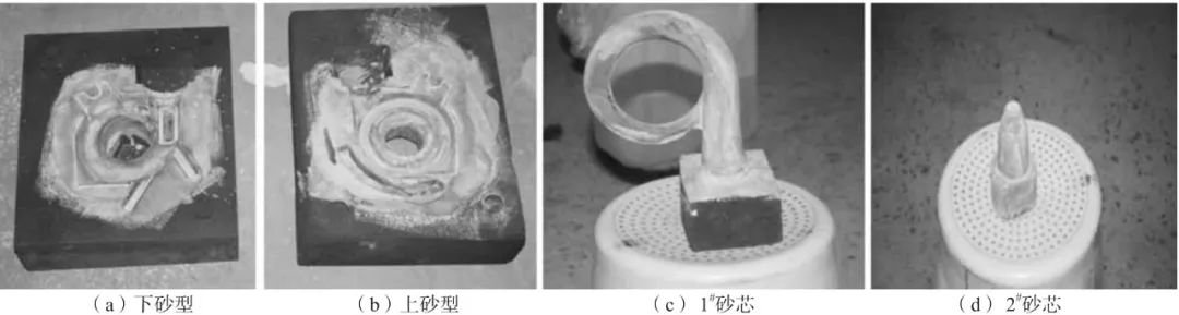 圖10 優(yōu)化工藝方案的縮孔縮松缺陷模擬結果 從圖10中可以看出,壓殼鑄件本體內縮孔、縮松缺陷全部消除。因此,采用如圖9所示的最終鑄造工藝方案進行生產試制。 5.壓殼鑄件的實際生產 5.1 鑄型的加工處理 采用樹脂砂利用數字化無模精密鑄造成形機(型號為CAMTC-SMM2000)分別進行上型、下型和砂芯的數控加工。利用UG軟件的加工模塊生成砂型和砂芯的加工刀路,其中粗加工選用的刀具為Φ8 mm的平刀;精加工時,選用Φ6 mm的球刀,切削參數中的連接改為沿部件斜進刀,在層與層之間切削。 在加工好后的砂型和砂芯上分別涂刷醇基鋯英粉涂料,刷好涂料的砂型和砂芯如圖11所示。裝配好砂芯的下型如圖12所示。