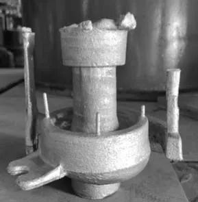 圖12 裝配好砂芯的下型 5.2 鋁合金的熔煉澆注及鑄件的后處理 接 著 進 行 合 型 , 準 備 澆 注 。將 所 需 重 量 的AlSi7Mg0.3(ZL101A)鑄造合金錠放入到坩堝電阻爐中進行加熱熔煉,設定熔煉溫度為750 ℃,澆注溫度為(730±5)℃。采用鋁合金專用除氣除渣劑進行熔體處理,采用Al-5Ti-1B對鋁合金熔體進行變質處理。 鑄件冷卻1 h后進行打箱和落砂處理,用工具將鑄件分型面位置的飛邊毛刺清理掉,最后獲得的鑄件(帶鑄造工藝)如圖13所示。 對鑄件進行了質量檢驗,尺寸符合BS6615/ISO8062及工程標準E3-20的要求,可見,缺陷符合工程規(guī)范E4-05-006的要求,化學成分符合《鑄造鋁合金》國家標準規(guī)范中的相關質量要求。