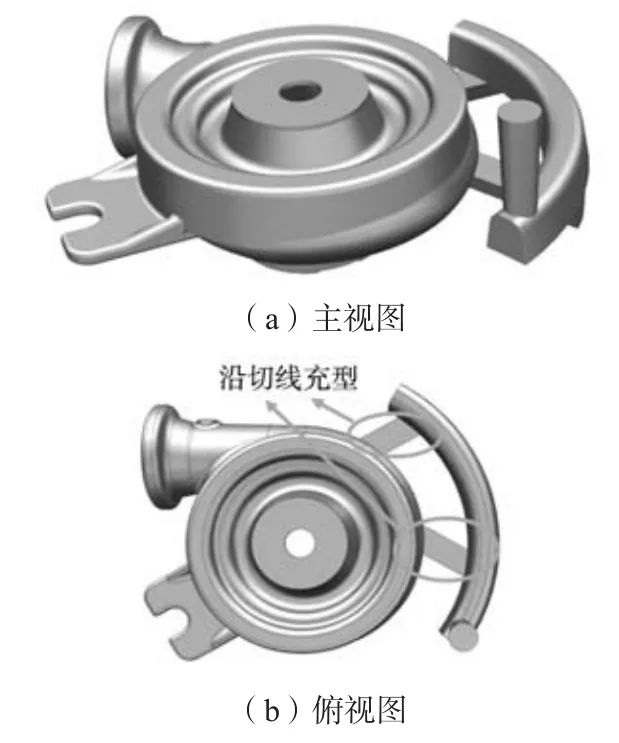 圖3 兩個砂芯的三維模型圖 由于該件為小型鑄鋁件,在查鑄造手冊和相關資料后得知,鑄鋁件主要采用開放式澆注系統。開放式澆注系統在充型時可以保證充型液流速度低,從而充型平穩(wěn),還可以避免紊流和氧化膜卷入,從而保證進入型腔中的金屬液相對純凈,故本次工藝采用開放式澆注系統,各澆道截面比為ΣA直 ∶ΣA橫 ∶ΣA內 =1∶1.4∶1.3。而且,采用中注式澆注系統,金屬液從中部流入型腔。由于該件結構為渦輪殼體結構,易在充型過程中產生卷氣的現象,因此側邊注入式的內澆道部分采用沿切線方向進行充型,這樣可以減輕卷氣,同時更有利于金屬液平穩(wěn)地進入型腔。澆注系統的形狀如圖4所示。