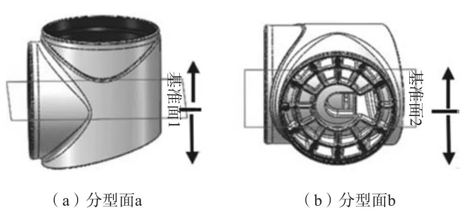 表1 YL113合金成分 wB/% 2.壓鑄工藝設計 在模具設計中,壓鑄工藝最為重要,直接影響鑄件的質量、生產成本、模具制造難易程度等。壓鑄工藝包括分型面的選擇、澆注系統的設計、溢流和排氣系統的設計。 2.1?分型面的選擇 機殼殼體形狀比較復雜,需要設置抽芯機構,故模具制造較難,因此鑄件采用一模一腔的鑄造方式。根據分型面選擇的最基本原則:選擇鑄件投影面積的最大區域。本鑄件有兩種分型面設置方法,如圖2所示,采用分型面a,只需設置一個抽芯機構,但鑄件型腔較深,型芯包緊力較大,鑄件不易脫出;其次鑄件壁較薄,不易設置推出機構。采用分型面b,鑄件需設置多個抽芯機構,模具制造復雜,但是鑄件上下基本對稱,鑄件充型平穩,其次方便設置推出機構,有利于溢流槽和排氣槽的設置,更能滿足壓鑄工藝要求,故本鑄件選擇分型面b。