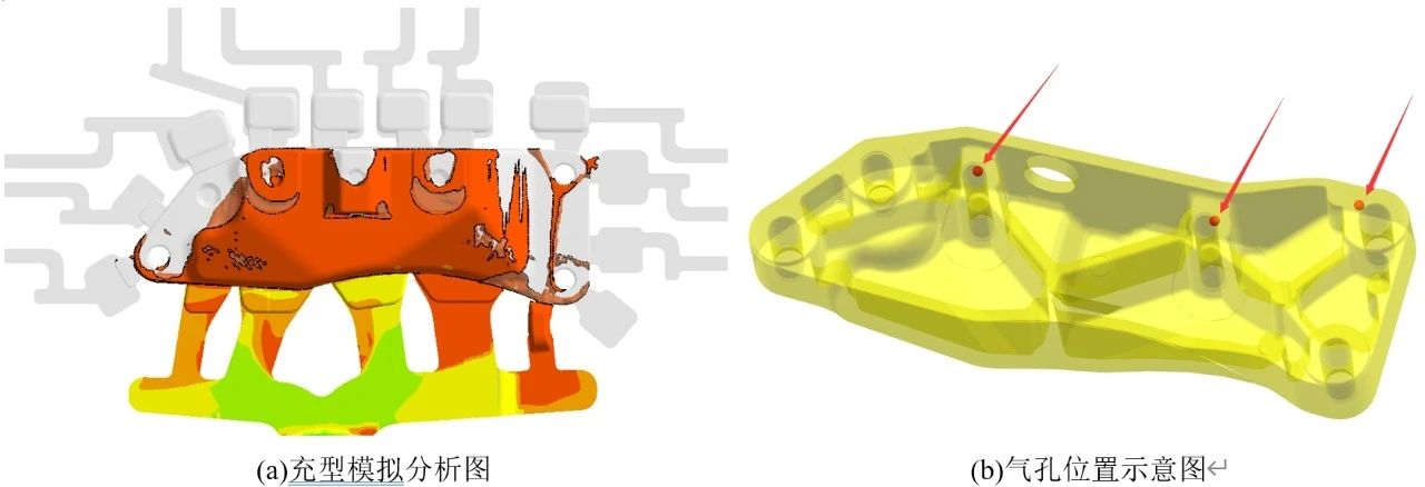 圖8 零件氣孔區(qū)域位置圖 3.3.2 模擬分析缺陷的形成原因 鑄件各區(qū)域排氣良好,氣孔出現(xiàn)部位位于澆口遠(yuǎn)端,可能是鋁液中卷氣夾雜沒(méi)有徹底排出導(dǎo)致的,結(jié)合現(xiàn)場(chǎng)壓鑄實(shí)際情況,采用現(xiàn)場(chǎng)壓鑄生產(chǎn)參數(shù)再次進(jìn)行模擬分析,模擬分析與實(shí)際缺陷對(duì)比見(jiàn)圖9。可以看出,鑄件左側(cè)出現(xiàn)鋁液包卷的趨勢(shì);鑄件中間區(qū)域較慢,有裹氣的風(fēng)險(xiǎn);鑄件右側(cè)區(qū)域中鋁液流速過(guò)快,直接將渣包進(jìn)料位置封堵,使渣包無(wú)法再進(jìn)行排氣,缺陷位置與實(shí)際試產(chǎn)情況吻合。