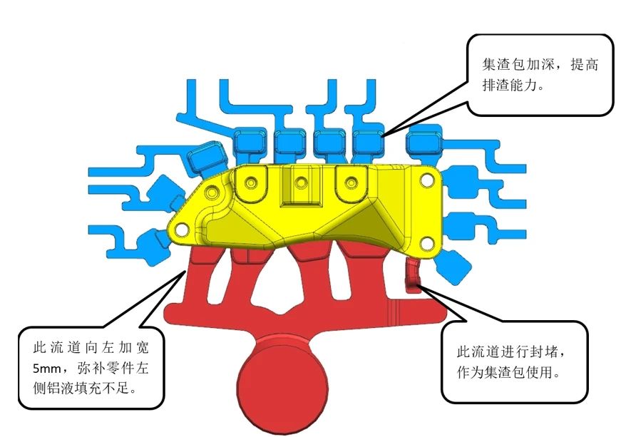 圖9 模擬分析與實(shí)際缺陷對(duì)比 4.工藝優(yōu)化 4.1 工藝優(yōu)化措施 對(duì)澆排系統(tǒng)進(jìn)行調(diào)整,最左側(cè)流道向左加寬5 mm,彌補(bǔ)零件左側(cè)鋁液填充不足;中部區(qū)域的集渣包加深,提高排渣能力;對(duì)最右側(cè)流道進(jìn)行封堵,作為集渣包使用,減緩右側(cè)區(qū)域填充速度。工藝優(yōu)化方案見(jiàn)圖10。