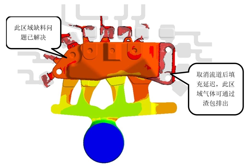 圖10 工藝優(yōu)化方案圖 4.2 工藝優(yōu)化驗(yàn)證 調(diào)整后再次采用CAE軟件進(jìn)行模擬,模擬結(jié)果見(jiàn)圖11。可以看出,調(diào)整左側(cè)流道后,鑄件左側(cè)缺料問(wèn)題得到解決;取消右側(cè)流道后,右側(cè)充型延遲,右側(cè)區(qū)域氣體可通過(guò)渣包排出。
