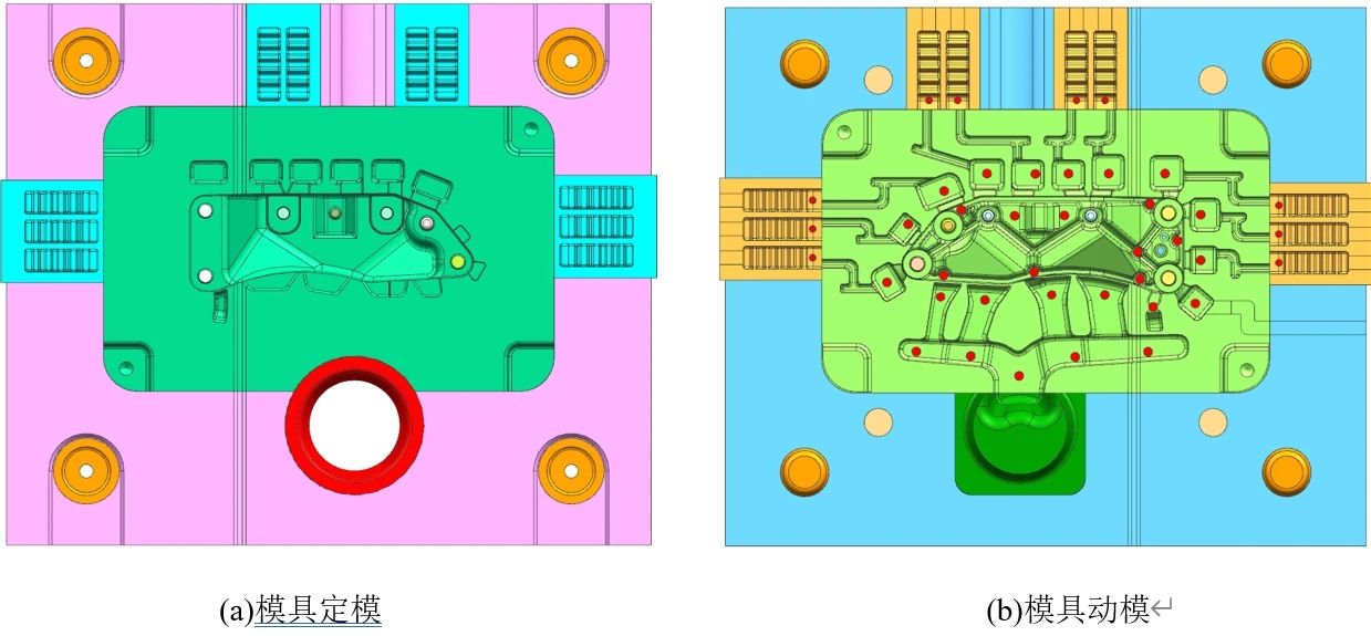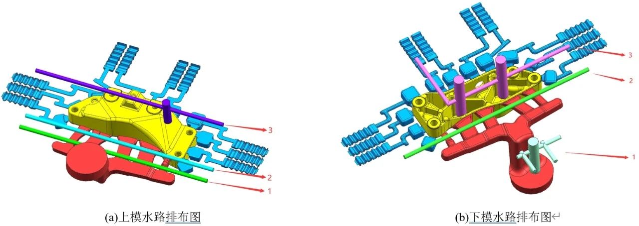 圖3 冷卻系統(tǒng)設(shè)計(jì)圖 上模水路排布采用直通冷卻加水井結(jié)構(gòu)。水路1作用為降低模具澆口側(cè)溫度,保證模具熱平衡;水路2在降低澆口側(cè)溫度時(shí),冷卻鑄件側(cè)面,避免側(cè)面開(kāi)模時(shí)出現(xiàn)拉傷、沖料等壓鑄缺陷;水路3起冷卻鑄件的作用,由于鑄件有形狀高低,所以增加冷卻水井,確保鑄件冷卻均勻。 下模水路排布采用直通冷卻加水井結(jié)構(gòu)。水路1作用為冷卻料餅區(qū)域,此區(qū)域?yàn)檎麄€(gè)鑄型中最厚的區(qū)域,凝固最晚,增加冷卻可縮短此區(qū)域冷卻時(shí)間,提高生產(chǎn)效率;水路2作用為降低模具澆口側(cè)溫度,保證模具熱平衡,水路3在降低澆口側(cè)溫度的同時(shí)冷卻鑄件內(nèi)部,減輕進(jìn)澆口對(duì)模具的沖蝕,同時(shí)避免鑄件在此區(qū)域出現(xiàn)的拉傷、沖料等壓鑄缺陷;因?yàn)殍T件有形狀高低,所以增加冷卻水井,使水路跟隨鑄件形狀進(jìn)行冷卻,確保鑄件冷卻均勻。 2.3 模具設(shè)計(jì) 根據(jù)澆排系統(tǒng)與冷卻系統(tǒng)設(shè)計(jì)模具見(jiàn)圖4。