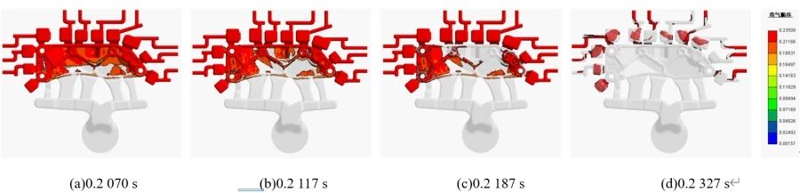 圖4 模具設(shè)計(jì)圖 3.數(shù)值模擬與缺陷分析 3.1 模擬參數(shù)設(shè)置 采用CAE軟件對(duì)所設(shè)計(jì)壓鑄工藝方案進(jìn)行充型凝固過(guò)程模擬。根據(jù)工藝設(shè)計(jì),澆注溫度為660 ℃,活塞直徑為80 mm,壓射速度低速為0.5 m/s,高速為2.7 m/s。模具材料為SKD61鋼,預(yù)熱溫度為120 ℃,工作溫度為200 ℃。冷卻介質(zhì)設(shè)置為水,控制進(jìn)口水溫為25 ℃。 3.2 充型過(guò)程分析 鑄件充型過(guò)程反面示意圖見(jiàn)圖5。可以看出,鑄件充型0.2 070 s時(shí),金屬液通過(guò)內(nèi)澆口呈發(fā)散狀進(jìn)入型腔,見(jiàn)圖5a;鑄件充型0.2 117 s時(shí),鑄件的下端型腔基本填充完成,金屬液往上繼續(xù)填充型腔,見(jiàn)圖5b;鑄件充型0.2 187 s時(shí),鑄件的中部型腔幾乎填充完成,金屬液開(kāi)始充填兩側(cè)型腔,兩側(cè)充型過(guò)程基本保持同步,有少量金屬液流向溢流槽,見(jiàn)圖5c;鑄件充型0.2 327 s時(shí),鑄件幾乎填充完成,金屬液流向溢流槽,見(jiàn)圖5d;鑄件充型0.2 3500 s時(shí),充型完畢。充型分析顯示,當(dāng)充型結(jié)束時(shí),型腔完全充滿,沒(méi)有出現(xiàn)澆不足的現(xiàn)象。