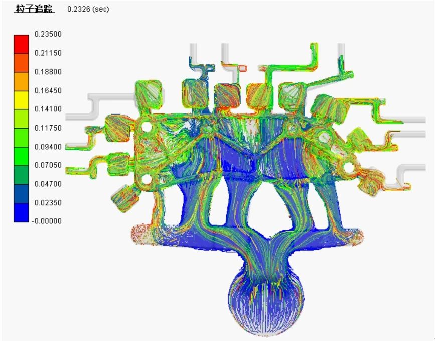 圖5 鑄件充型過(guò)程圖 粒子追蹤見(jiàn)圖7,可以看出,金屬液在填充型腔的絕大部分過(guò)程中,粒子彎折的情況較少,大部分以流暢的曲線向前充型,充型平穩(wěn),卷氣情況較少。