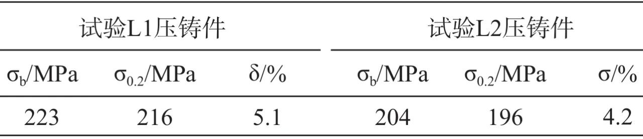 圖4 拉伸試樣 采用GP-TS2000A力學試驗機對試驗L1、L2的兩組壓鑄件進行力學性能測試。每組試驗取6個有效拉伸數據,所獲得的數據標準差在2.5以內,試驗結果表明,試驗L1采用新型真空抽氣系統制得的壓鑄件其各項力學性能指標比試驗L2只采用齒狀排氣系統制得的壓鑄件均得到了顯著提高,其中抗拉強度達到223 MPa,較齒狀排氣壓鑄件提高了9.3%,屈服強度和伸長率也分別提高了10.2%和21.4%,如表3。