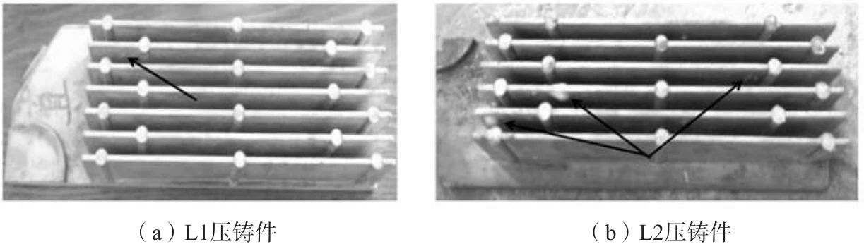 圖5 鑄件金相組織圖 3.3 真空壓鑄件熱處理性能分析 壓鑄件通過T6處理后的宏觀形貌,見圖6。試驗L2壓鑄件散熱片表面出現了7~8個大小不一的氣泡,其中較大的2個直徑達到6 mm,其余直徑為0.4~3 mm。而試驗L1壓鑄件散熱片表面只有1片出現了直徑為1.5 mm的氣泡。由圖分析可知,試驗L1采用主、副排氣管道的新型真空抽氣系統能夠有效地減少鑄件內部的氣體,減少縮松、縮孔等缺陷,從而提高鑄件的致密度,提高鑄件整體的力學性能。