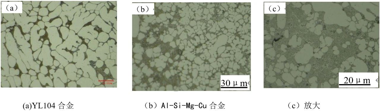 圖3 YL104合金與Al-Si-Mg-Cu合金的金相組織照片 圖3為YL104壓鑄合金和Al-Si-Mg-Cu合金的組織對(duì)比,可以看出,兩種合金中白色組織為α-Al基體,枝晶間灰色組織為共晶組織,但Al-Si-Mg-Cu合金中α-Al基體更加圓整,尺寸明顯變小,最小可達(dá)到3μm。其中圖3c中能發(fā)現(xiàn)部分粗大的α-Al,這部分粗大的枝晶應(yīng)該是在壓室內(nèi)形成的,在壓室內(nèi)凝固、長(zhǎng)大,最后被沖頭壓入型腔形成的。由于放大倍數(shù)的限制,還有部分黑色未知組織需進(jìn)行更細(xì)微的分析。 根據(jù)Al-Si-Cu相圖,當(dāng)Mg含量為0.5%,銅含量≤0.5%時(shí)合金凝固后相組成為[α-Al+Si+Mg2Si+Al5Mg8Cu2Si6],由于Mg、Cu、Zn等合金元素含量較少,添加的Mg、Cu、Zn等合金元素大部分都溶解于Al基體中,因此在微觀組織照片中很難發(fā)現(xiàn)以上元素形成的特征相。通過(guò)EDS分析發(fā)現(xiàn)α-Al基體中溶有Mg、Cu、Zn、Si等合金元素,起到固溶強(qiáng)化的作用,見(jiàn)圖4。