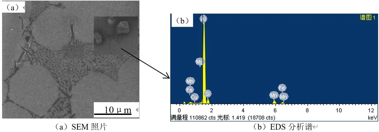 圖4 Al-Si-Mg-Cu合金微觀組織與EDS分析 通過(guò)SEM進(jìn)一步分析,可以觀察到黑色的纖維狀組織和塊狀的亮灰色組織,見(jiàn)圖5。經(jīng)EDS分析(Al的質(zhì)量分?jǐn)?shù)為82.2%,Si的質(zhì)量分?jǐn)?shù)為16.2%),纖維狀組織為共晶Si,由于合金在熔煉階段加入了Sr變質(zhì),Sr將原本細(xì)長(zhǎng)的板條狀共晶Si變?yōu)榧?xì)小的纖維狀結(jié)構(gòu),細(xì)化后的共晶硅尺寸在2μm左右,Sr的加入極大地削弱了共晶Si對(duì)基體的割裂作用。亮灰色組織為Fe相。在鋁硅系合金中鐵相主要以漢字狀α-AlFeSi和針狀β-AlFeSi相存在。根據(jù)SEM觀察,發(fā)現(xiàn)此Fe相為塊狀,判斷此相并不是上述兩種相。根據(jù)Lin Chong等研究,在Al-Si合金添加Mn后發(fā)現(xiàn)有塊狀的Fe相Al4(Fe,Mn)Si2生成,經(jīng)過(guò)T6熱處理后轉(zhuǎn)變?yōu)閴K狀的Al5(Fe,Mn)Si。本研究的合金Si含量為9%,通過(guò)EDS譜分析(Al的摩爾分?jǐn)?shù)為74.52%,F(xiàn)e的摩爾分?jǐn)?shù)為4.49%,Mn的摩爾分?jǐn)?shù)為8.23%,Si的摩爾分?jǐn)?shù)為12.11%),綜合鐵相的形貌,認(rèn)為此組織為Al5(Fe,Mn)Si。由于Mn的影響,形貌得到了改善,對(duì)于基體的割裂效果明顯減弱。綜上所述,鑄態(tài)的合金微觀組織主要由細(xì)化的α-Al、纖維狀的共晶Si和塊狀的Fe相組成。