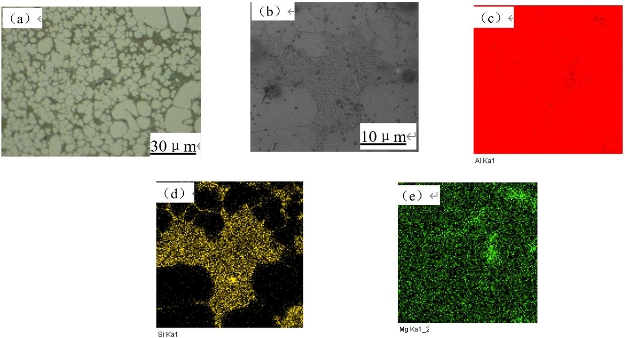 圖6 140℃時(shí)效后Al-Si-Mg-Cu合金的微觀組織和元素分布:(a)金相照片(b)SEM照片(c)Al元素分布(d)Si元素分布(e)Mg元素分布 圖6為140℃ 時(shí)效后Al-Si-Mg-Cu 合金的微觀組織和元素分布。可以觀察到時(shí)效后的微觀組織主要還是初生α-Al和共晶Si相,對(duì)比圖3b,發(fā)現(xiàn)時(shí)效對(duì)于初生α-Al的形貌大小基本沒(méi)有影響,都是由細(xì)小的α-Al枝晶和少數(shù)粗大的α-Al枝晶組成。通過(guò)SEM分析可以發(fā)現(xiàn)(圖6b),在α-Al出現(xiàn)了一些彌散分布的黑色組織,經(jīng)EDS分析(圖6c、圖6e),此組織主要由Al與Mg組成,結(jié)合胡祖麒等的研究,Al-Mg-Si系合金生成的β-Al8Mg5相經(jīng)過(guò)時(shí)效處理后會(huì)重新固溶到鋁基體中,起到固溶強(qiáng)化的作用,分析此組織β-Al8Mg5相。 對(duì)時(shí)效后的組織進(jìn)行了EDS分析,見(jiàn)圖7。從圖7a可見(jiàn),在共晶Si中間有一圈灰色的環(huán)狀組織,組織主要構(gòu)成元素為Si和Mg,分析認(rèn)為是Mg2Si相;在圖7a左上角和正中間位置還存在形狀不規(guī)則的灰色組織,通過(guò)圖7b的EDS分析(Mg摩爾分?jǐn)?shù)為4.24%,Cu摩爾分?jǐn)?shù)為1.10%)和元素分布圖,發(fā)現(xiàn)該組織由Al、Mg、Si、Cu組成,且Mg與Cu摩爾比為4:1,因此判斷該組織為Al5Mg8Cu2Si6相。在壓鑄時(shí),Mg、Cu等元素由于含量較少能夠完全溶解于基體中,經(jīng)過(guò)時(shí)效處理,溶解于基體的強(qiáng)化相析出起到彌散強(qiáng)化的作用。Zn在鋁中有很大的溶解度,因此Zn主要起固溶強(qiáng)化的作用。綜上所述,時(shí)效處理后的合金組織主要有細(xì)小的α-Al、均勻分布的鈍化共晶Si、彌散分布的Mg2Si相和少量的Al5Mg8Cu2Si6相組成。